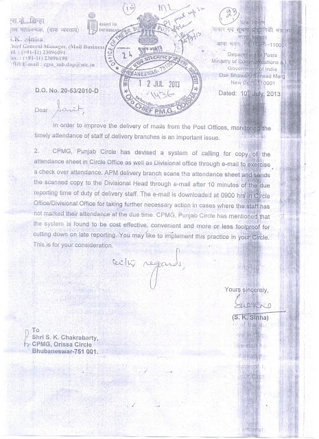 Monitoring of timely attendance of staff of delivery branches to improve the delivery of mails from the post offices