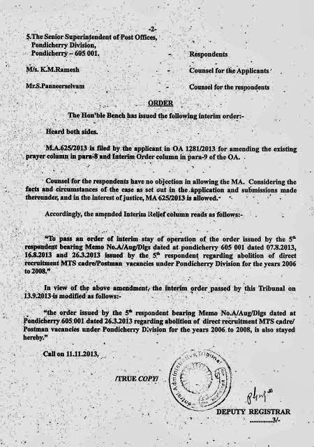 CAT STAY ON ABOLITION OF POSTMEN /MTS POSTS PONDICHERRY-TN